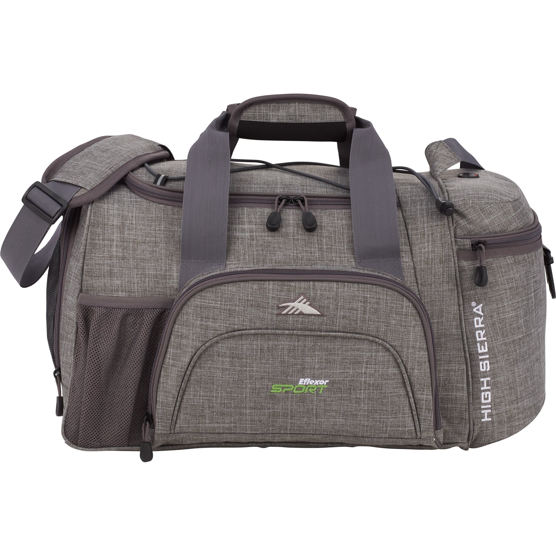 - The High Sierra Switch Blade Sport Duffel Bag includes a large main compartment with U-shaped opening and an end media pocket with a headphone port.