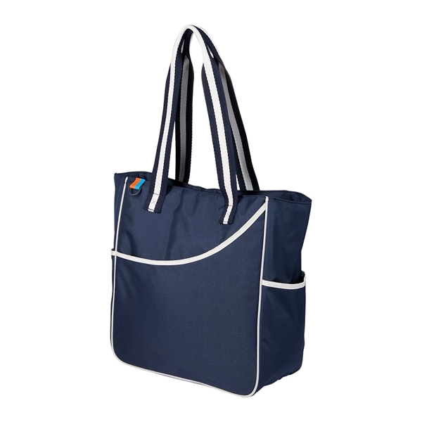 - This tote features a unique curved front pocket designed to securely hold your pickleball paddles or other essentials, while the snap-close main compartment and two side hydration pockets keep your belongings organized and accessible.