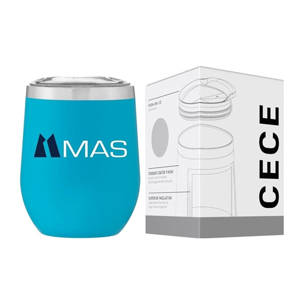 - 12 oz double wall 18/8 stainless steel thermal tumbler with copper vacuum insulation, clear push-on lid, stainless steel rim, and powder coated finish · gift box included