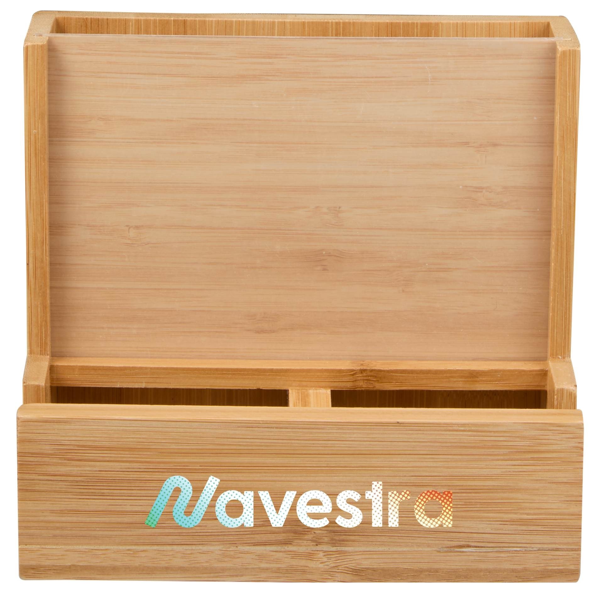 - Crafted from durable bamboo, this organizer features two front compartments for small items like paper clips and push pins, as well as a larger back compartment for pens, pencils, or markers.