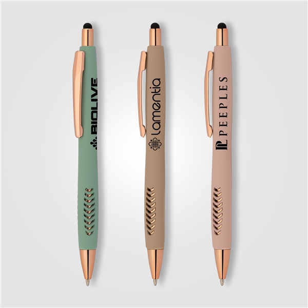Designed for effortless writing and luxurious appeal, this pen features a soft-touch finish and intricate rose gold detailing. Its built-in stylus adds an extra layer of convenience, making it a must-have tool in any modern professional’s collection. Plus, with customizable branding, it becomes a powerful promotional tool for any business.