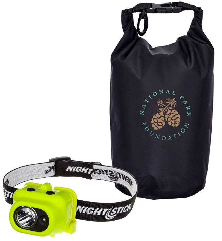 - Includes 3x AAA batteries, elastic non-slip headband, rubber hardhat strap and BG344 dry bag